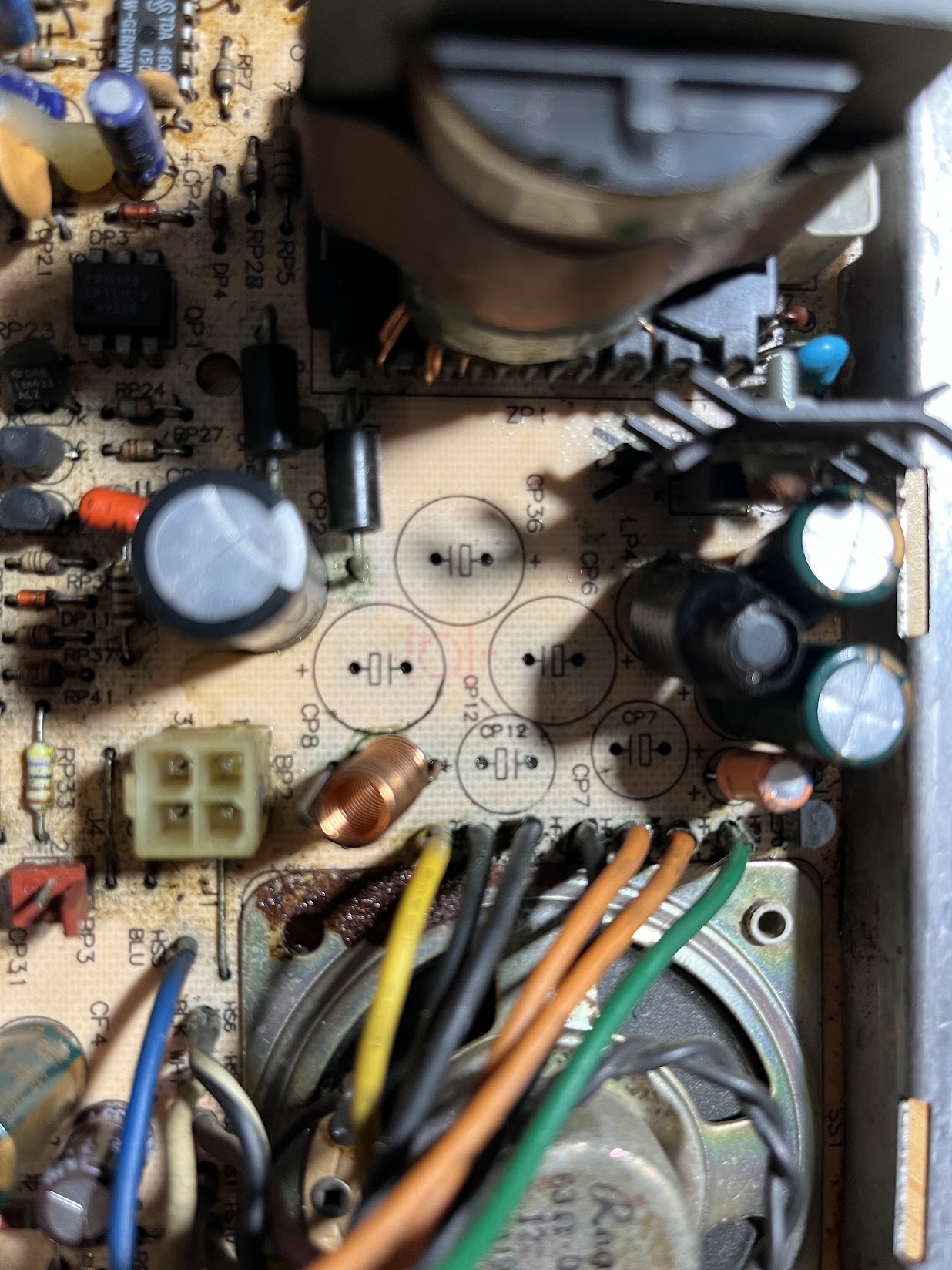 You can see the CP8 which is the previously leaked capacitor, leaves a gunk on the bottom of it and the surface of the PCB. I also need to clean those using IPA and replace them with the new one. Btw, beside the CP8 there is LP5 which is an inductor with missing ferrite. The glue has come off because of the capacitor leakage. Fortunately, I found the missing ferrite inside the case.
