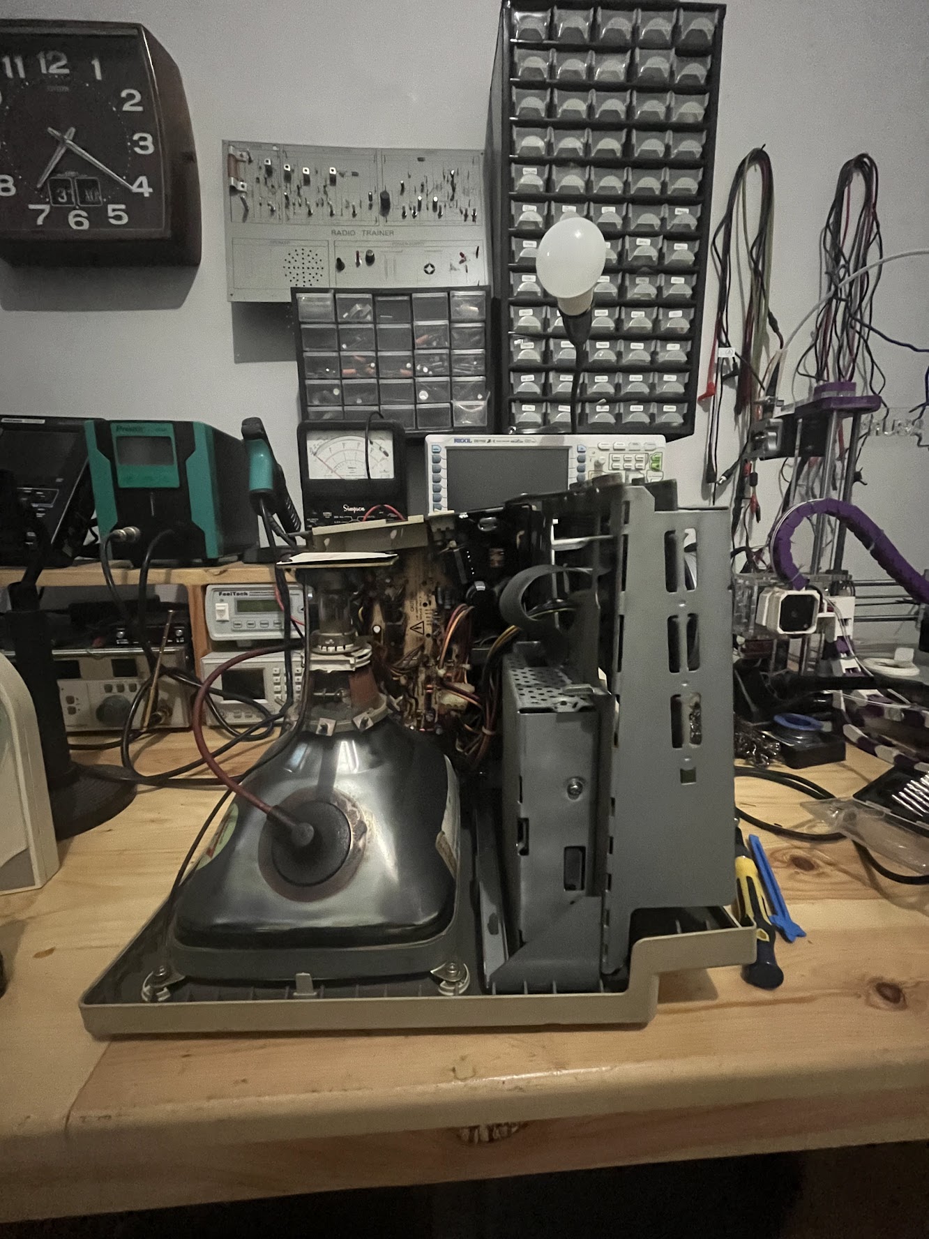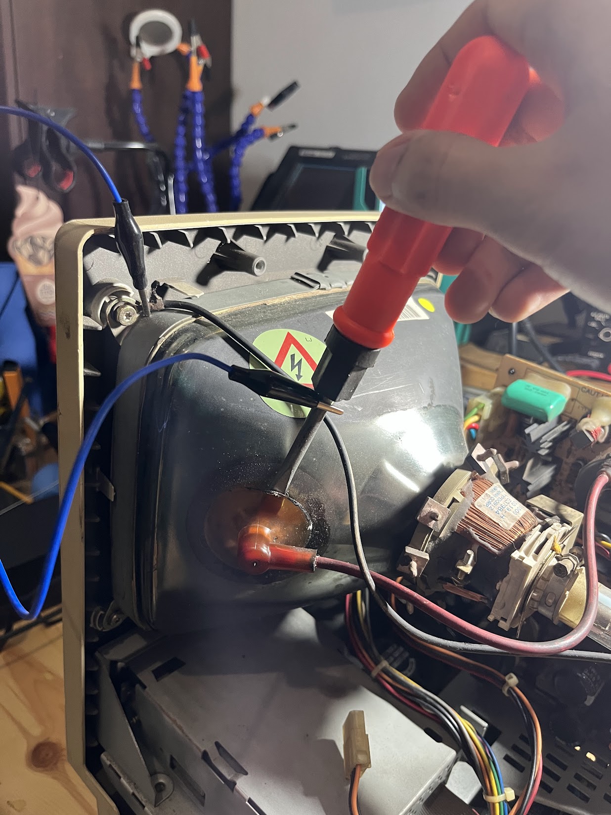 I tried to disassemble the analog board which I need to remove some cables from the CRT. This needs extra caution, especially for the flyback cable. You need to prepare a cable and a minus screwdriver, which will be used to ground the anode from the CRT.