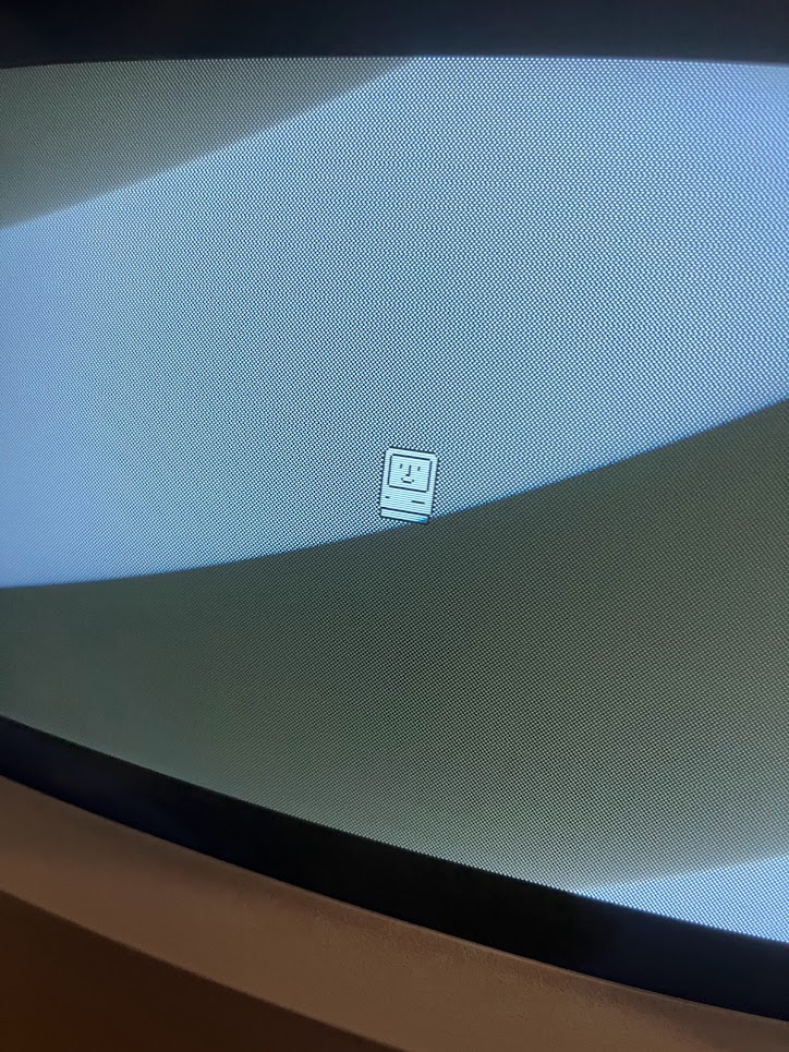 Tada! The vertical stripes are shown on the monitor. I didn’t expect to see this machine start normally though. Some of the machines on the Macintosh forums have the checkerboard screen, but mine has the vertical stripe screen.